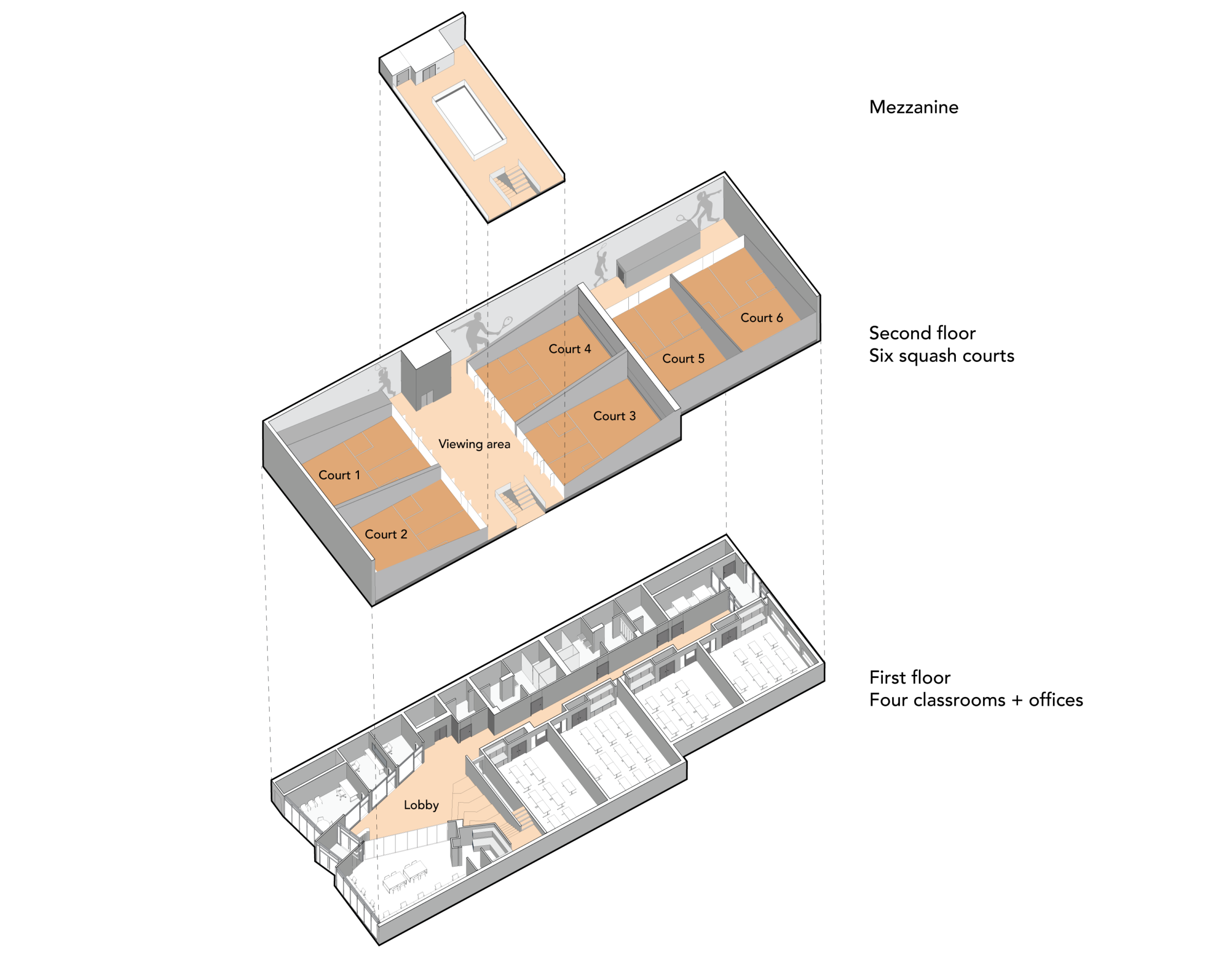 The site for CitySquash is tight, too long and too narrow for a sports facility layout. Rather than forcing a conventional solution onto an unconventional site, the building was conceived not as a linear sequence of courts, but as a compact world of squash organized around a shared center.