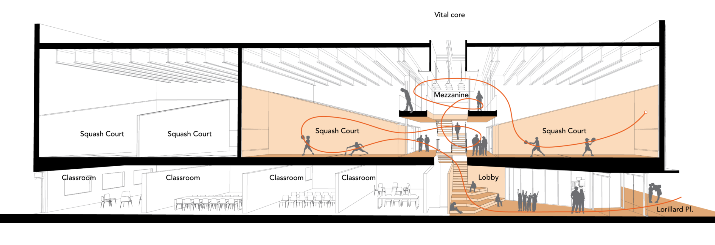 This vital core—part circulation, part void, part stage—is the heart of the building. Conceived as an extension of the courts, it is where the building gathers itself. Arriving from the street, visitors move inward and upward through it. On the ground floor, the stair widens into amphitheater-like seating. Maple—the required surface of the squash courts—reappears on the walls and within the stair opening, visually and materially pulling the world of squash down into the main lobby.
