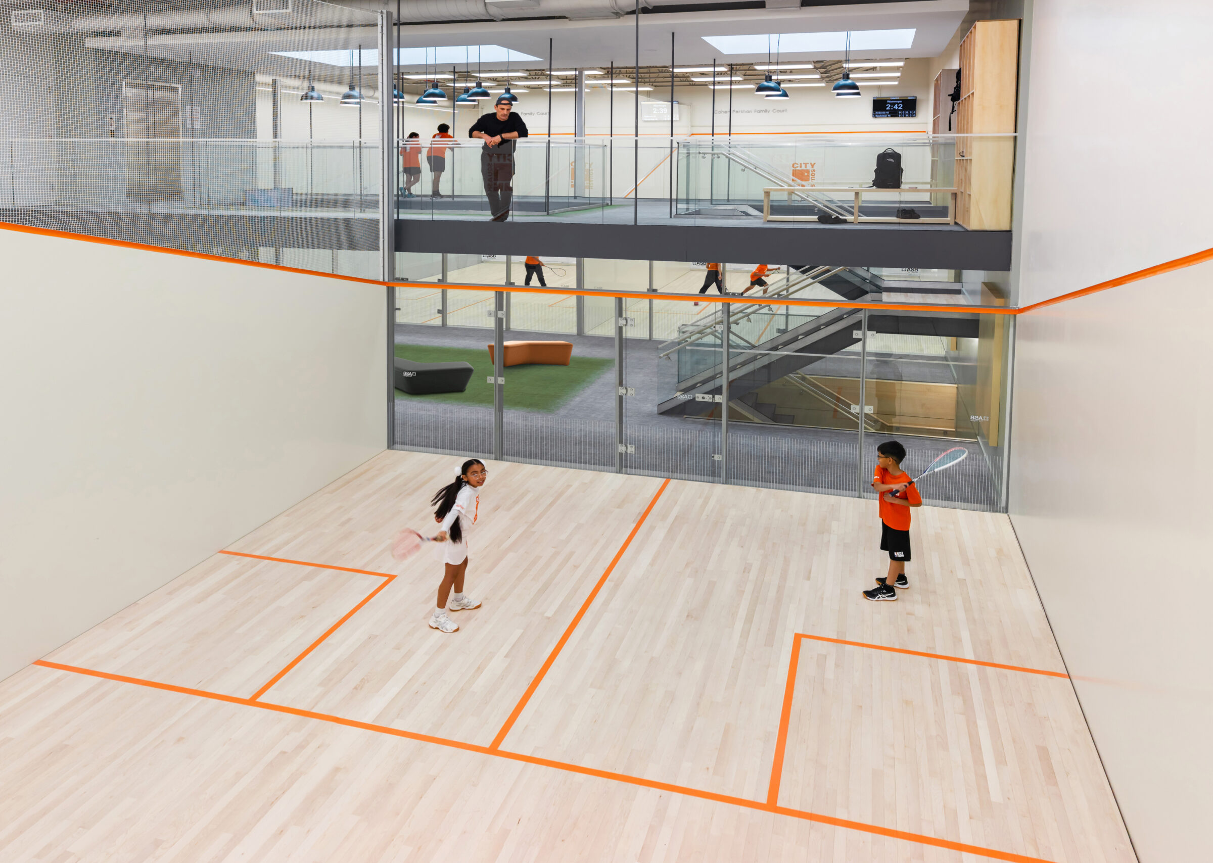 The courts were lifted to the second floor. This move made it possible to cluster four courts tightly together, a place where players could see one another, coaches could supervise multiple games at once, and the collective energy of the sport became part of the architecture.