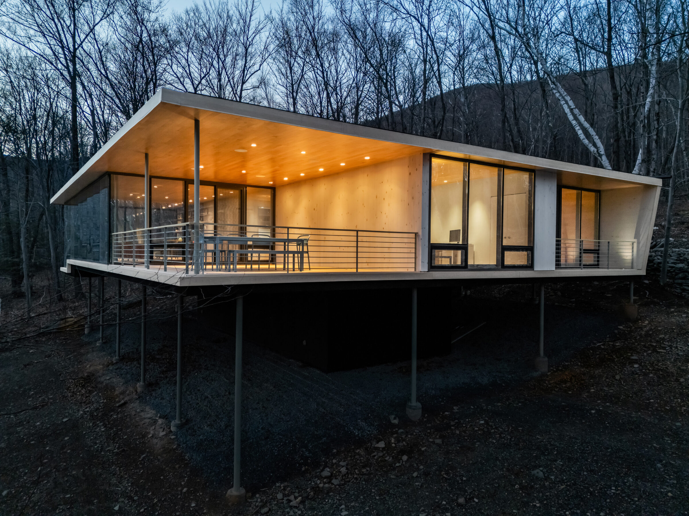 At Artist Retreat, privacy is not only spatial: each cube allows the ability to regulate its environment separately from the rest. Daylight is adjusted with large, solid sliding panels that hide away when fully opened. The wall is detailed with a simple reveal to indicate its operability. To allow fresh air in without disrupting the frameless appearance of the 8′ x 8′ fixed windows, each cube features a solid hinged door for access to the outdoors. Additionally, a pocketed sliding screen is concealed within the thickness of the exterior wall of each unit. To provide cross ventilation, a simple “attic fan” is placed on the roof to draw air through a continuous reveal along the perimeter of the ceiling, maintaining a visually uninterrupted ceiling plane. Additionally, the ceiling is designed to minimize the acoustic effects caused by moving air.