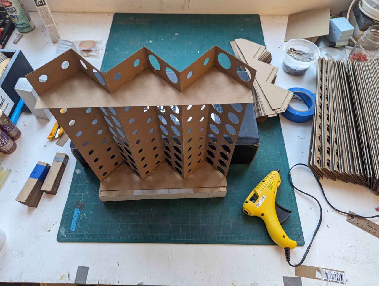 A simple, low-cost mock-up: laser-cut in the office, then assembled on site and spray-painted to simulate the metal facade.