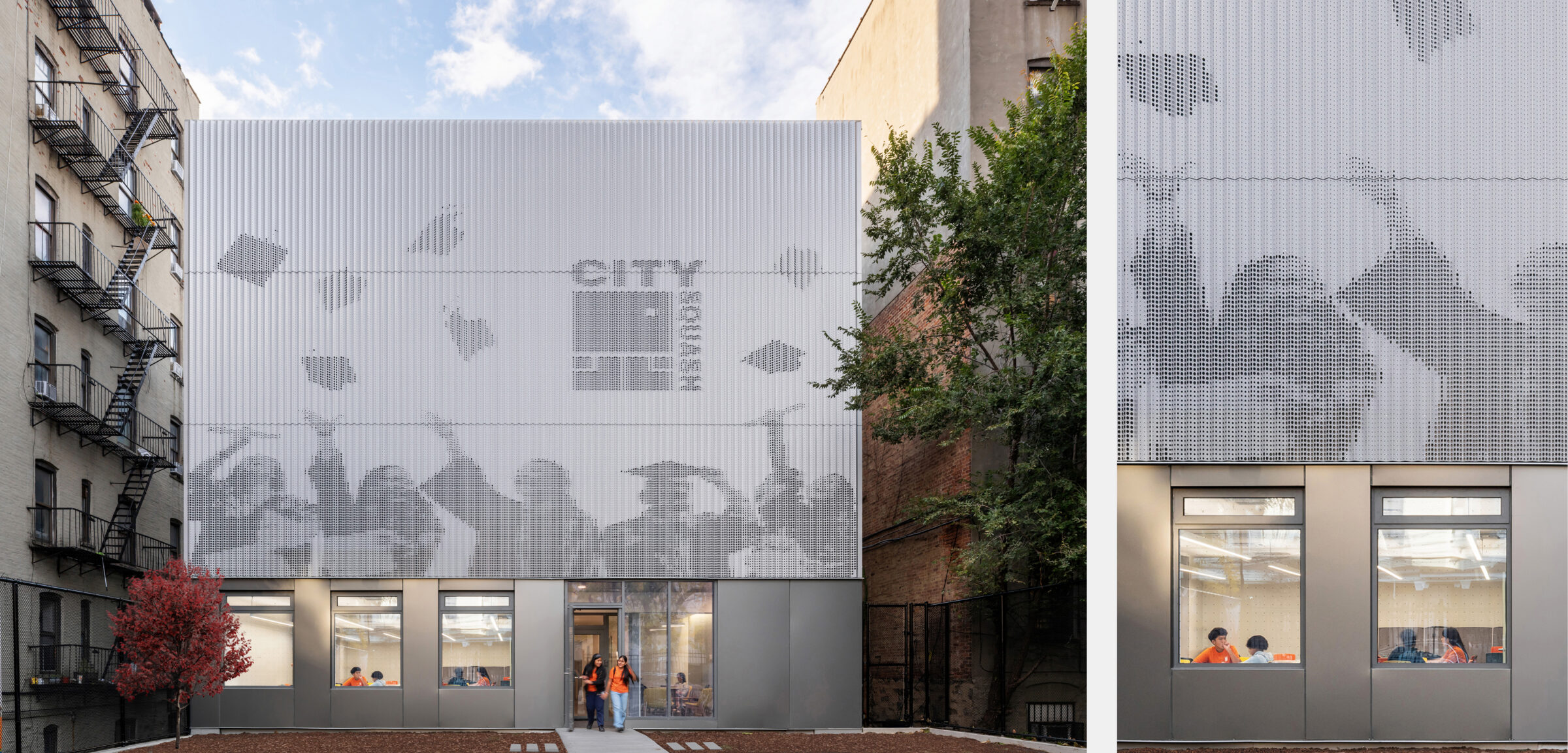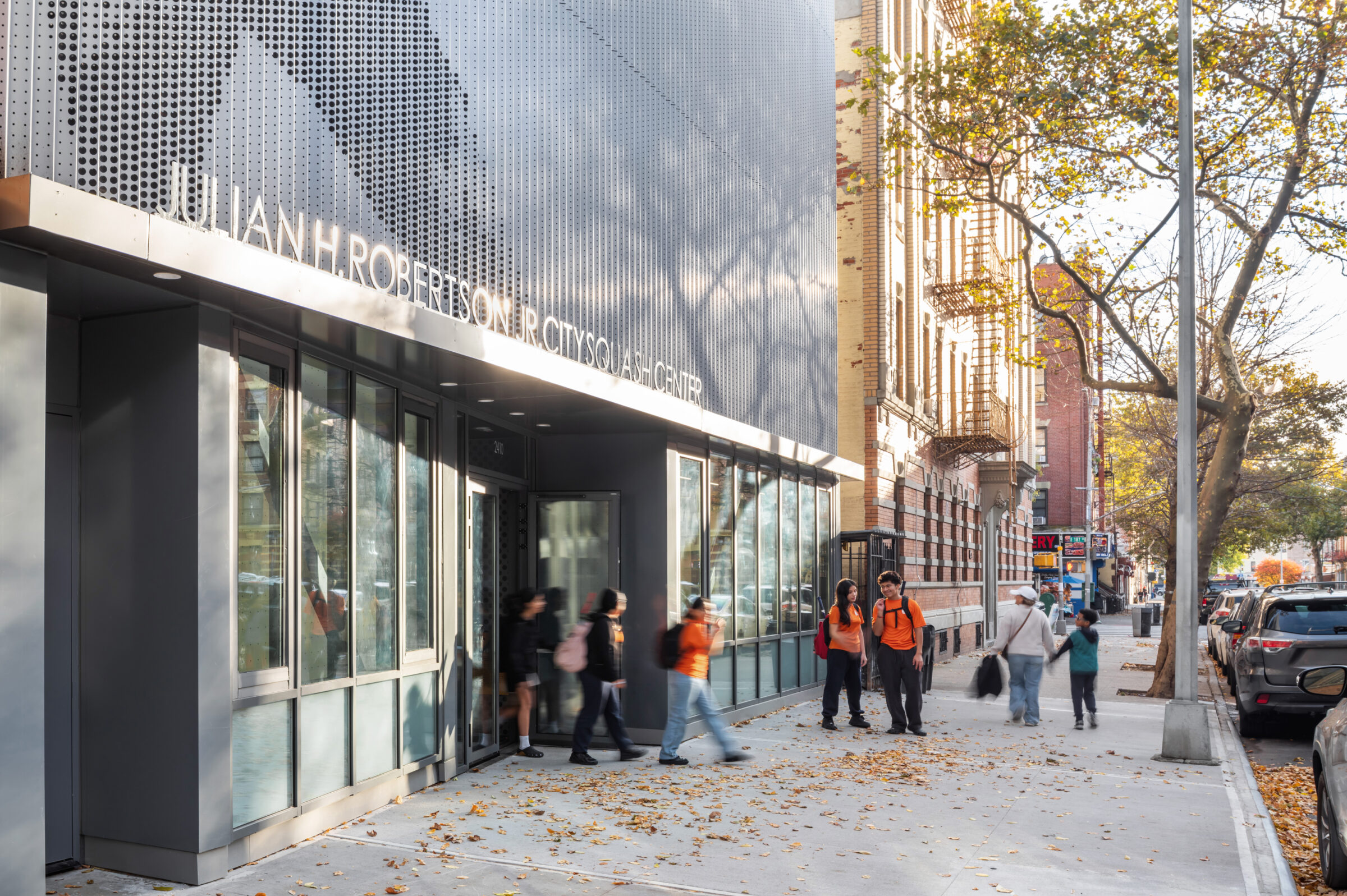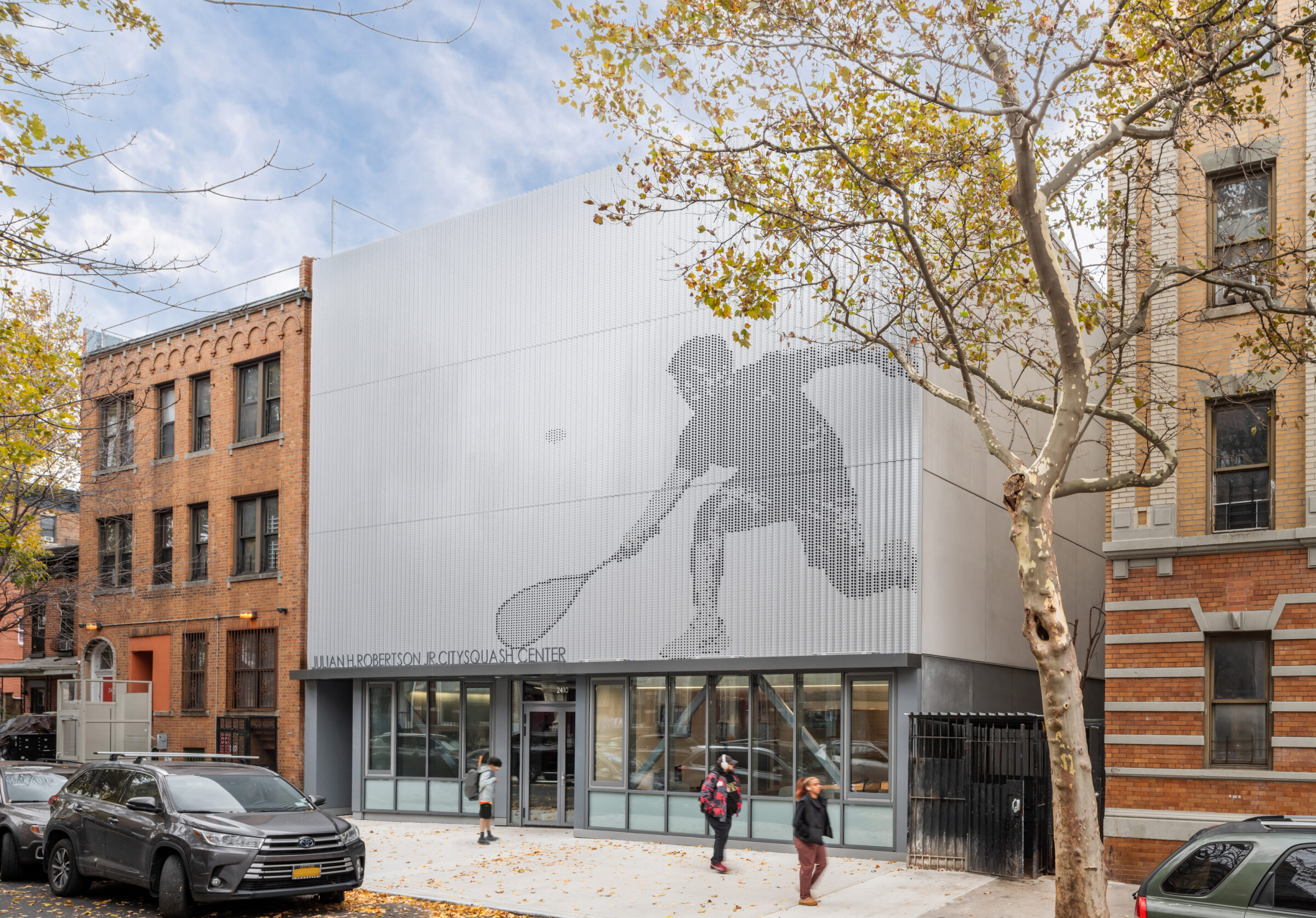 The building has two facades, each calibrated to its context and program. The front expresses squash—its speed, physicality, and play. The rear facade imagery shifts toward academics, reflecting learning as a parallel path to growth and success.