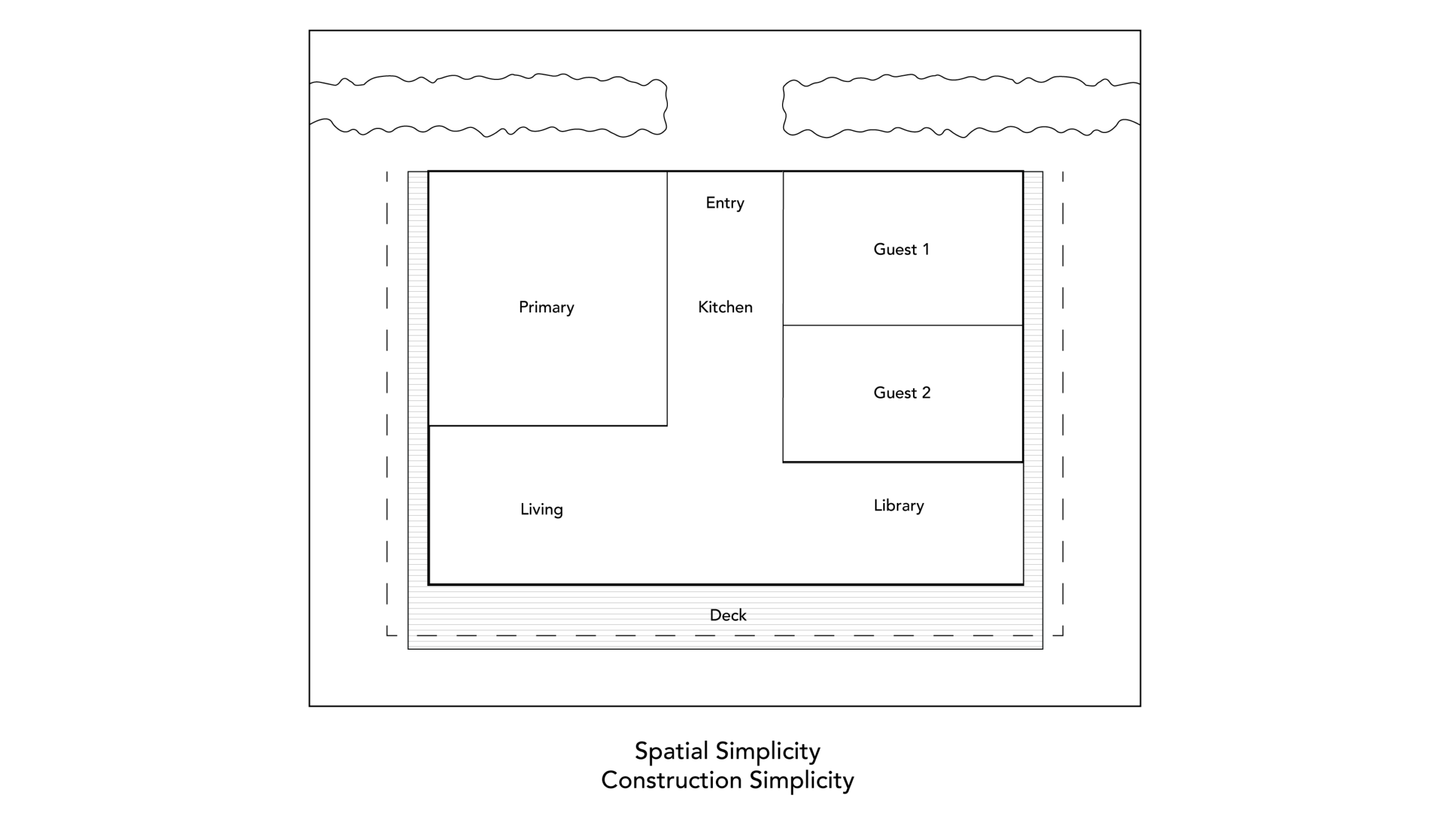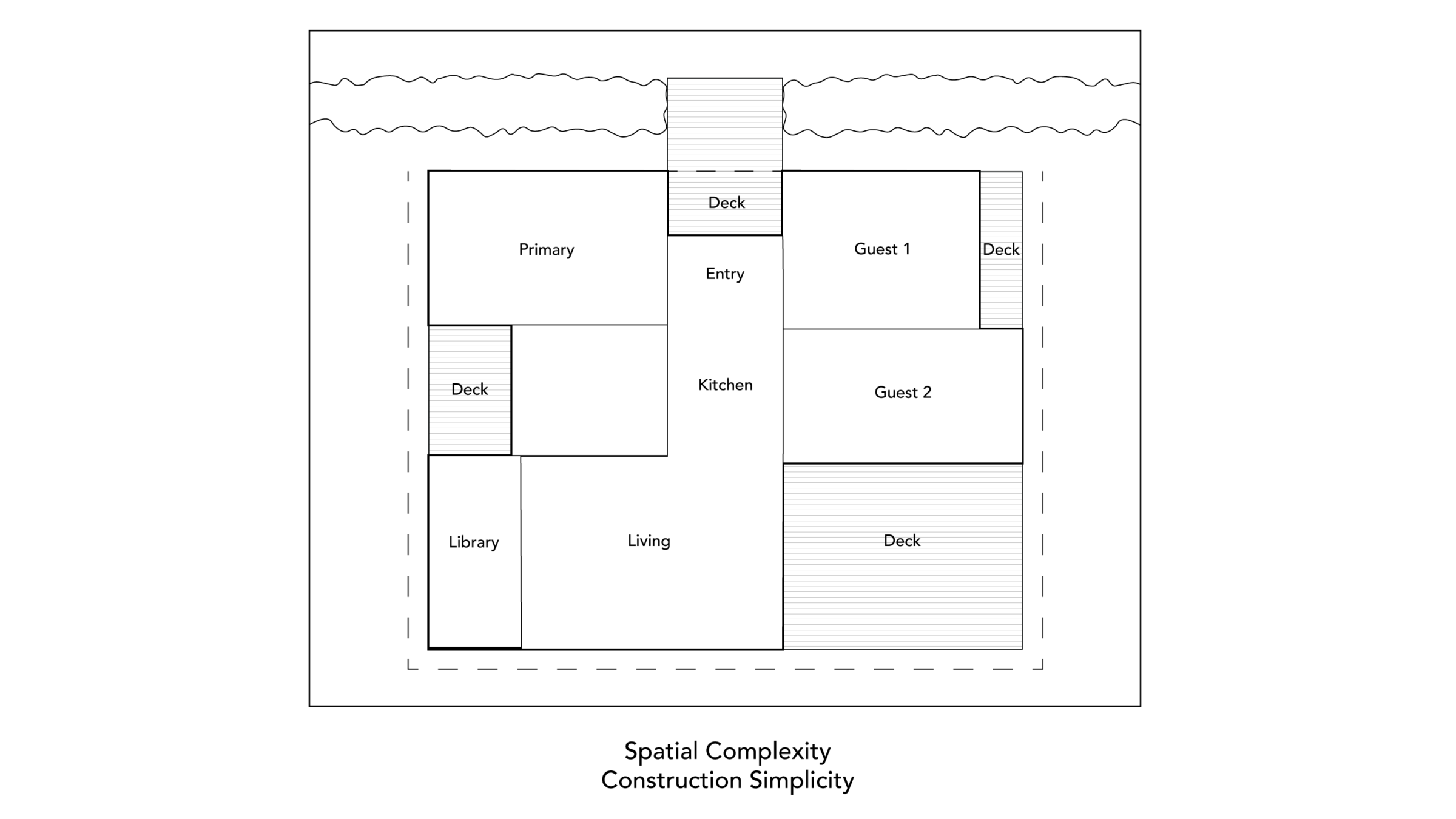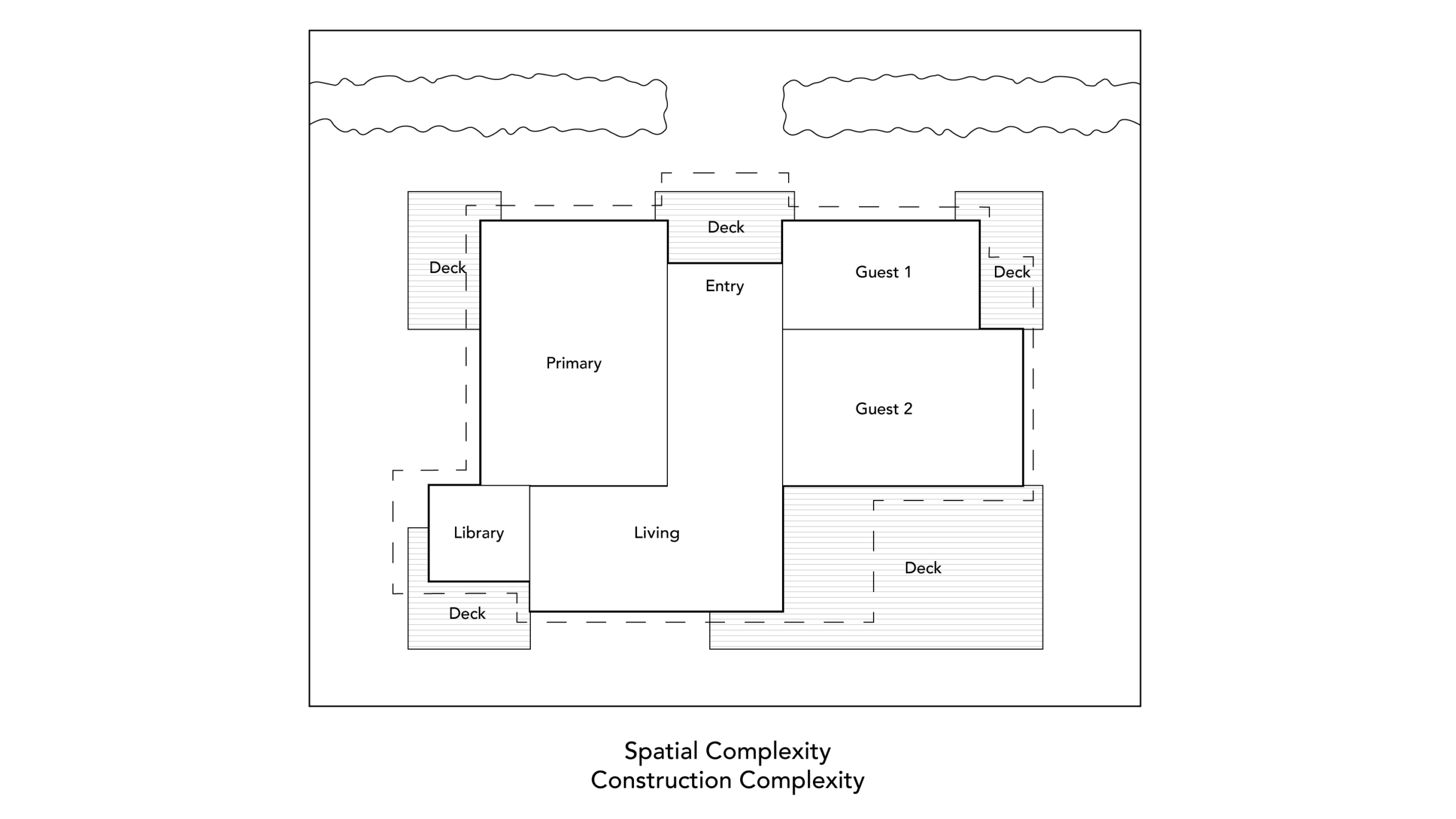 Understory House began with clear program pieces: three bedrooms, a kitchen, dining and living rooms, a library, and a deck. How to arrange these components, balancing spatial complexity with construction simplicity?